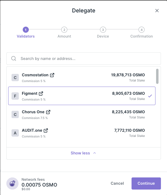 利用可能なOSMO残高がここに一覧表示されます。リストからバリデーターを選択してOSMOを委任します。