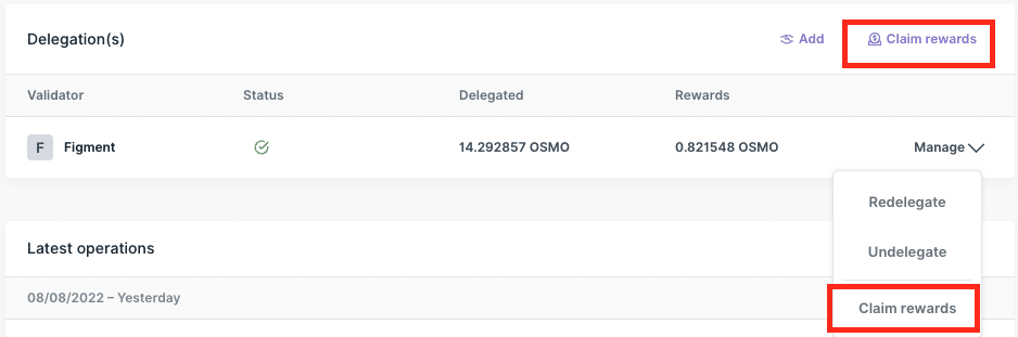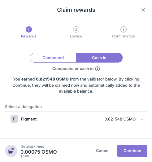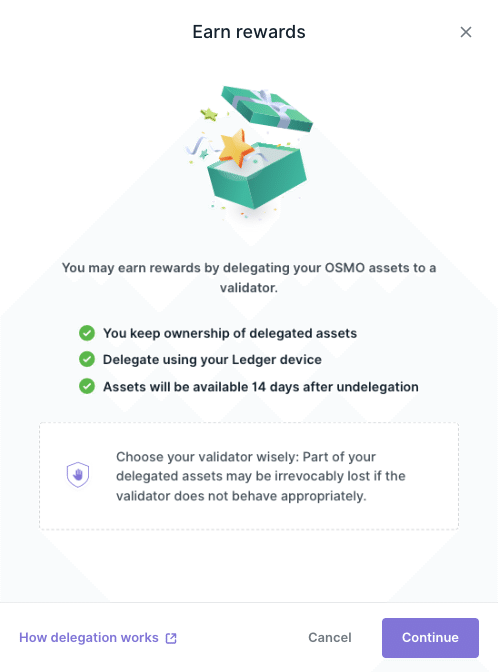 委任が完了すると、OSMOは毎日支払われるステーキング報酬の獲得を開始します。APYは、選択したバリデータのコミッションとOSMO残高によって異なります。レジャーライブは、最適化に役立つ潜在的な報酬を自動的に計算します。