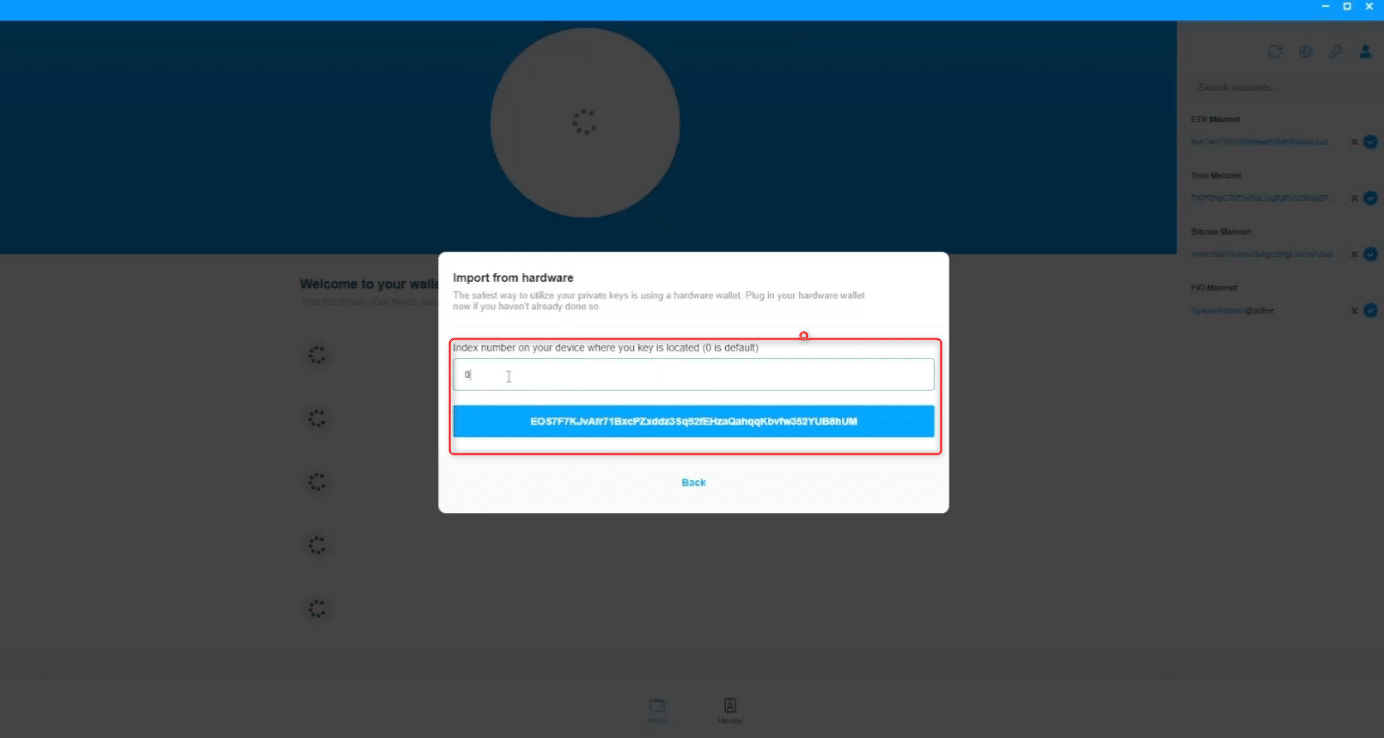 画面の指示に従って新しいEOSアカウントを設定し、EOS公開鍵を生成します。