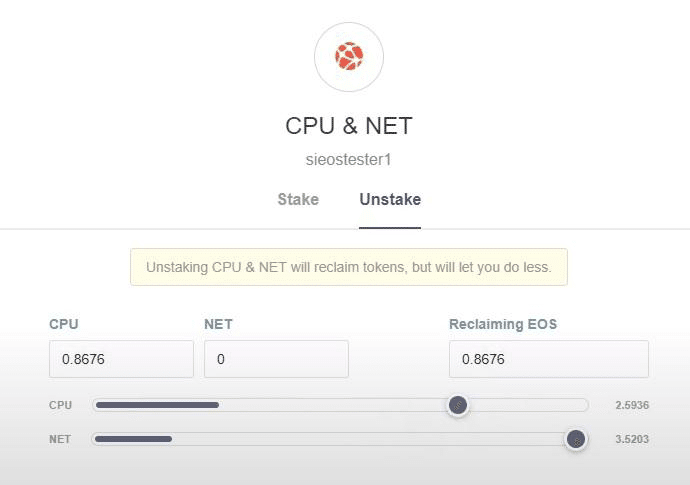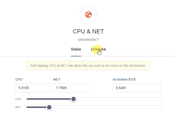 CPUおよびNETリソースからアンステークするEOS トークンの量を入力します。