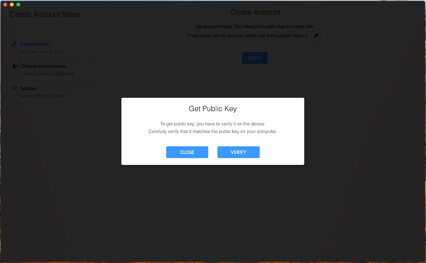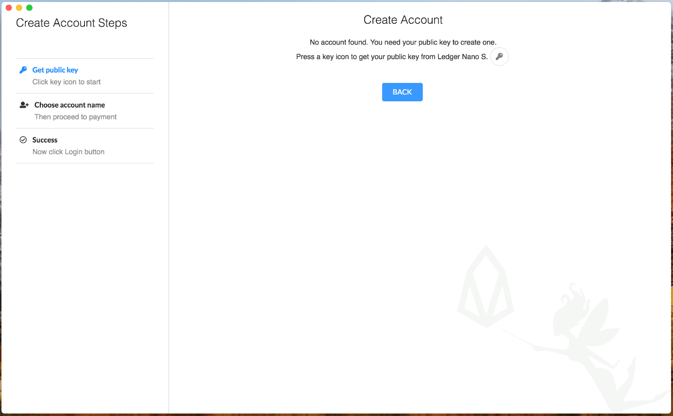 EOSブロックチェーンと対話するには、EOSアカウントが必要です。公開鍵は、次のステップでレジャーデバイスにリンクすると、フェアリーウォレット拡張機能から取得できます。