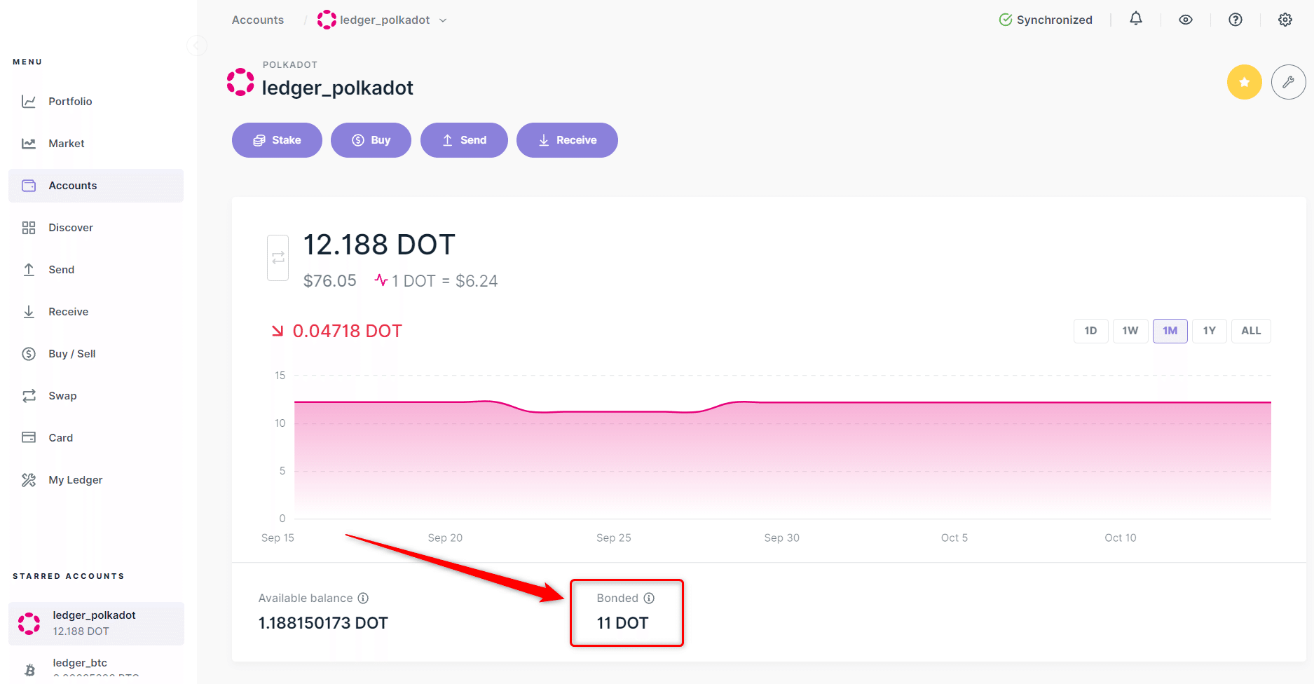 Polkadotネットワークでボンドトランザクションが承認されると、ボンドされたDOT残高がこちらに表示されます