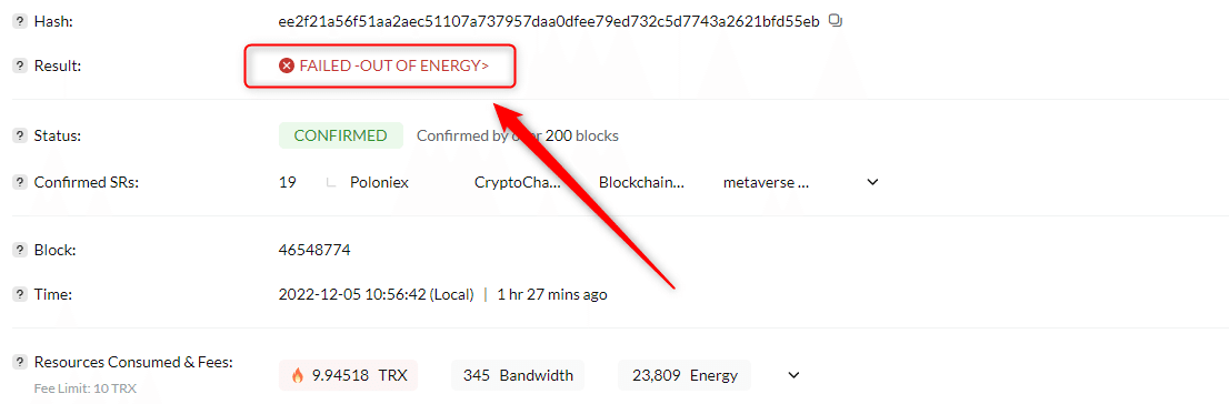 使用可能なTRXが不十分な場合、トランザクションはエネルギーを使い果たし、失敗します。