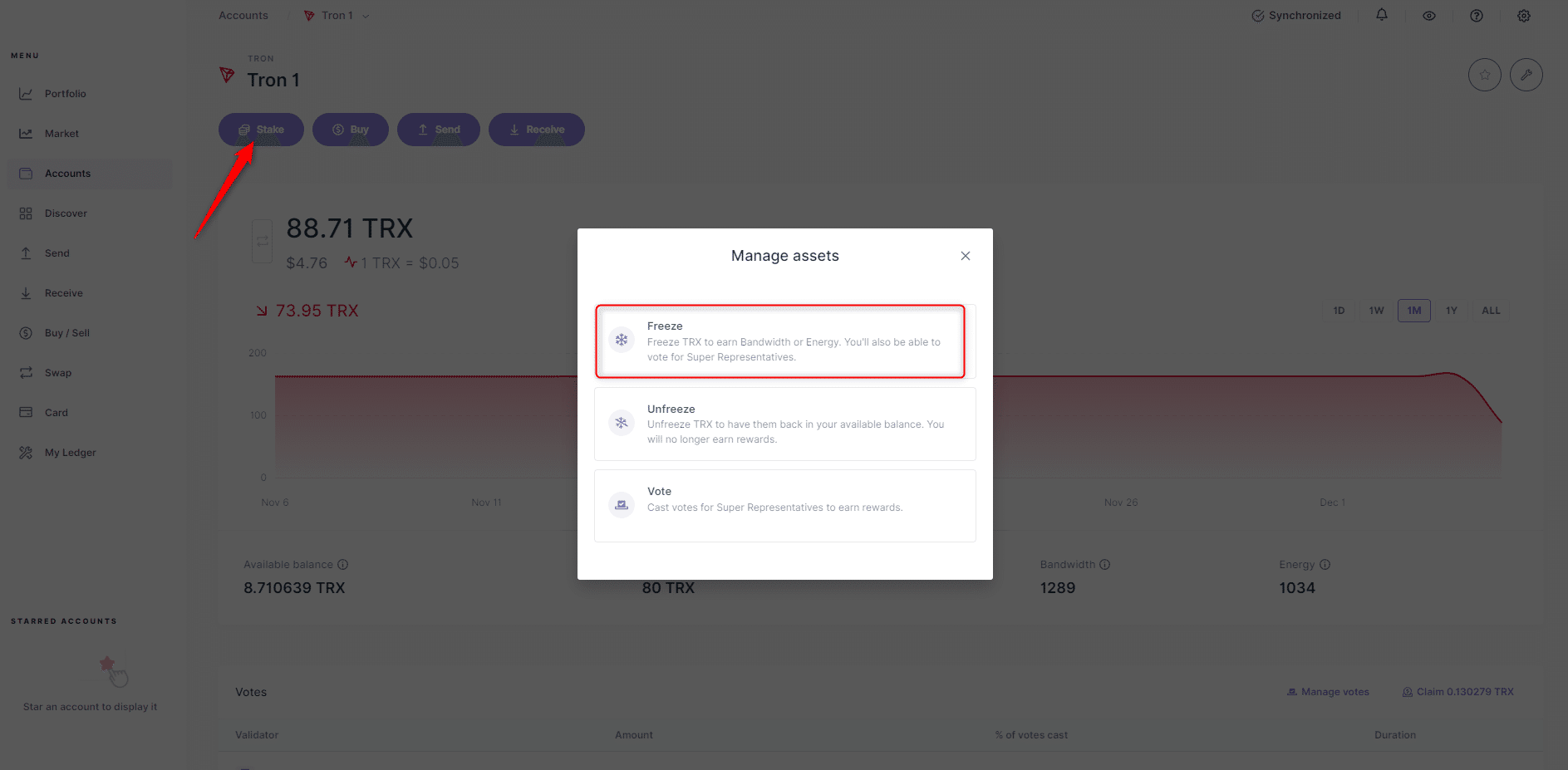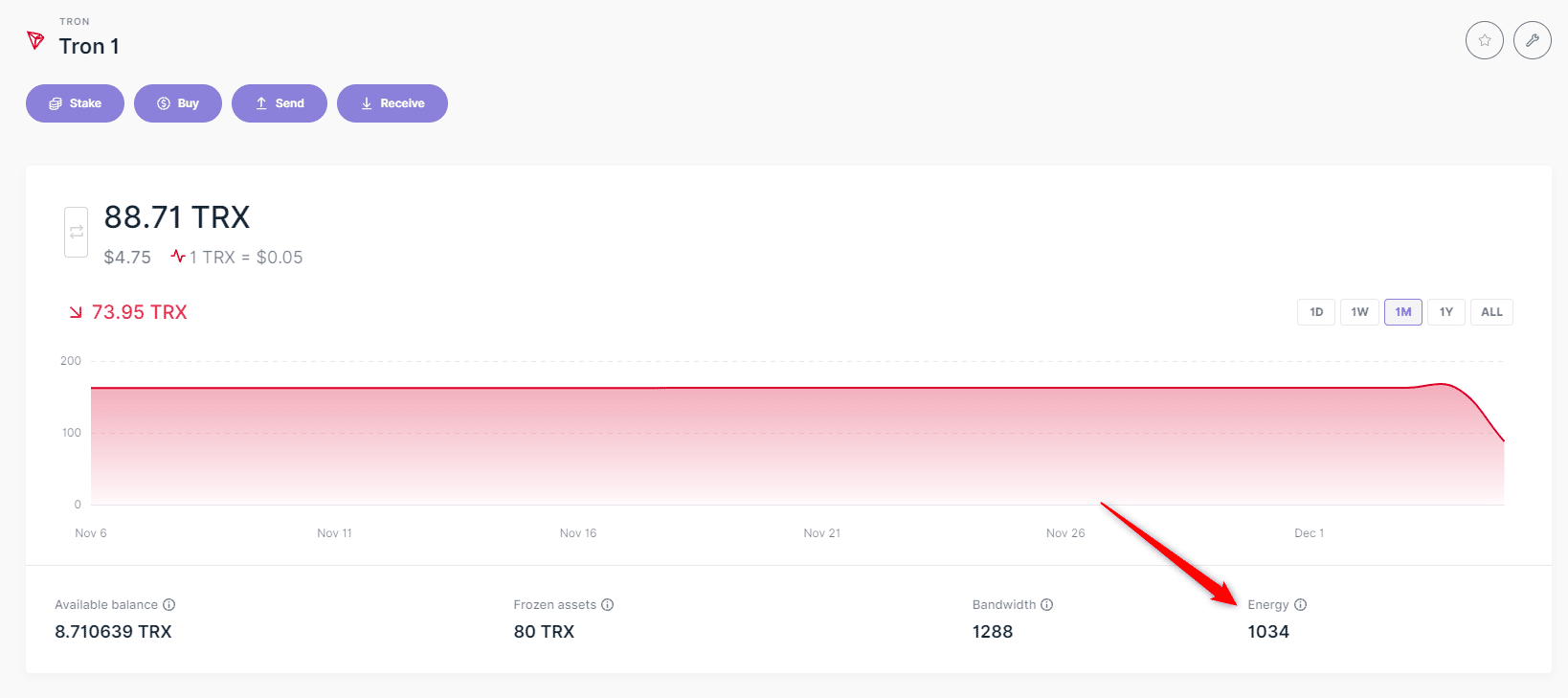 トロンのブロックチェーンでトークンを送信するには、トランザクションに電力を供給するためのエネルギーが必要です。エネルギー残高はレジャートロンアカウントに表示されます。