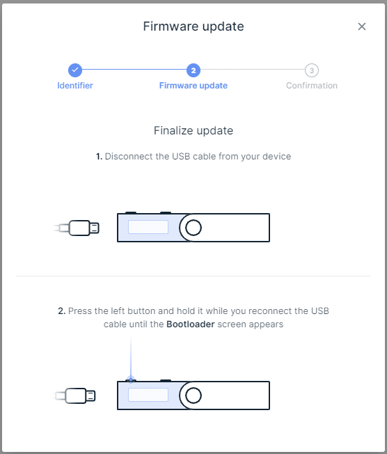 Ledgerデバイスの電源ボタン又はリセットボタンを、再起動するまで押し続けます。これによってソフトウェアの不具合が解消されて更新プロセスが最初から再開されます。