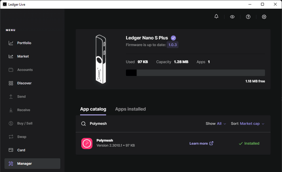 Ledger Live Managerに行き、アプリカタログを開いて「Polymesh」を検索してください。「インストール」をクリックして拡張機能をインストールします。これにより、Ledger NanoでPolymeshアプリを利用できるようになります。