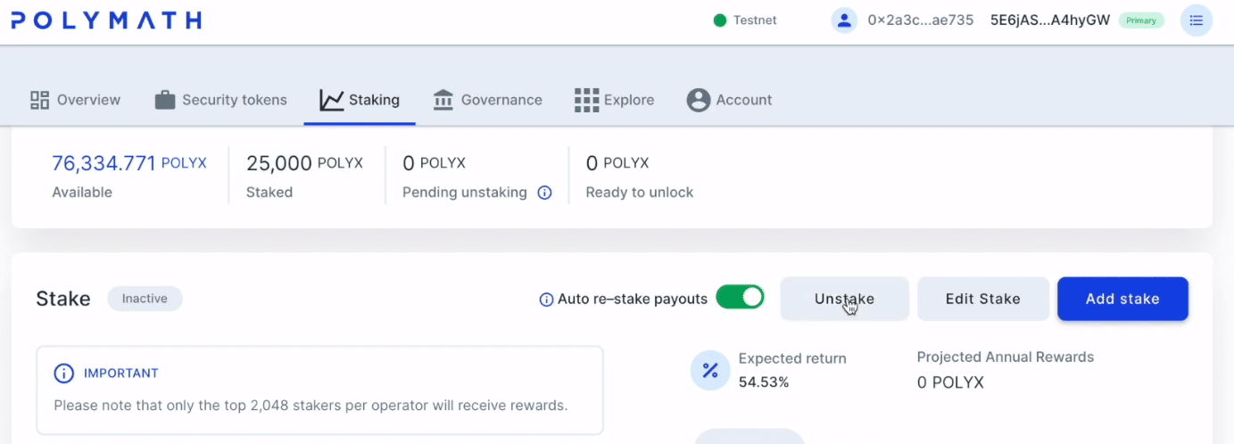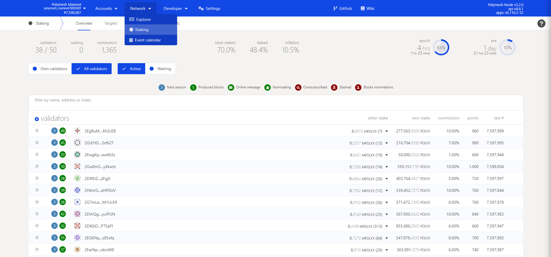 Polymeshネットワークに行き、ステーキングを選択してください。POLYXトークンをPolymeshネットワークのバリデータに委任するだけで、ステーキングAPYの獲得を開始できます。最良のリターンと信頼性を得るには、バリデータを慎重に調査してください。委任する前に、料金体系と稼働時間の指標を確認してください。