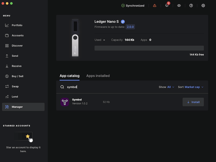 始めるには、LedgerデバイスにSymbolアプリをインストールする必要があります。[Ledgerマネージャー]で[Symbolアプリ]を探し、インストールします。インストールが完了したら、Ledgerでアプリを開いてください。