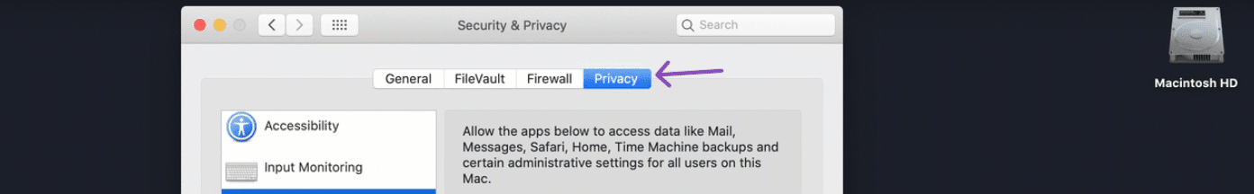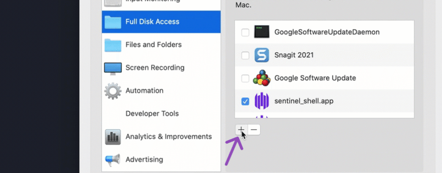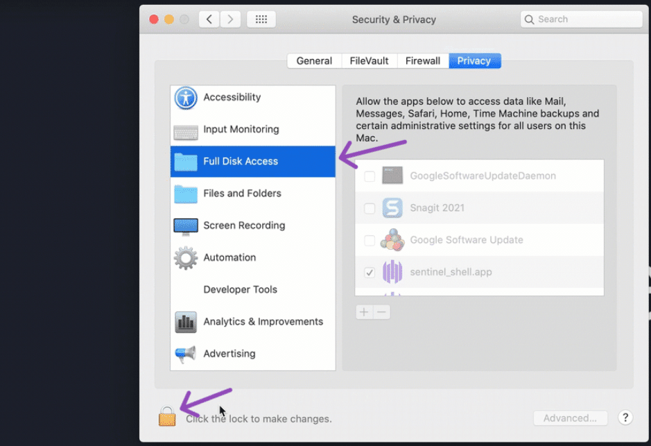画面の左隅にある[フルディスクアクセス]を選択し、画面の下にあるロックされたキーをクリックして、資格情報でロックを解除します。