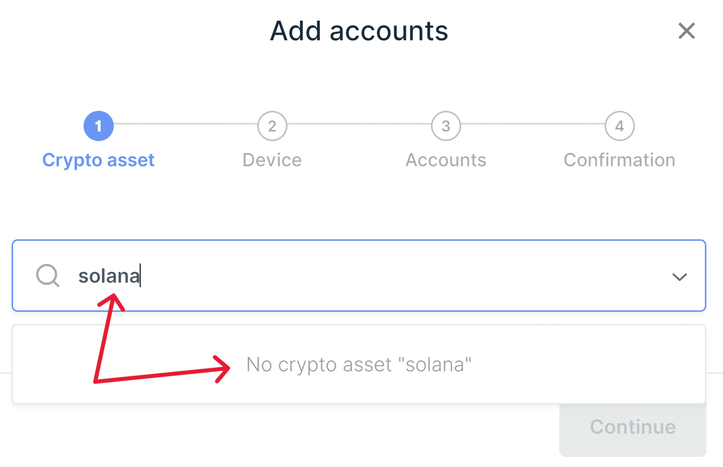 Ledger Liveでアカウントを追加しようとしているのに、アカウントリストで暗号資産が見つかる場合は、Ledger Liveが追加しようとしている暗号資産をサポートしていないことを単純に意味します。