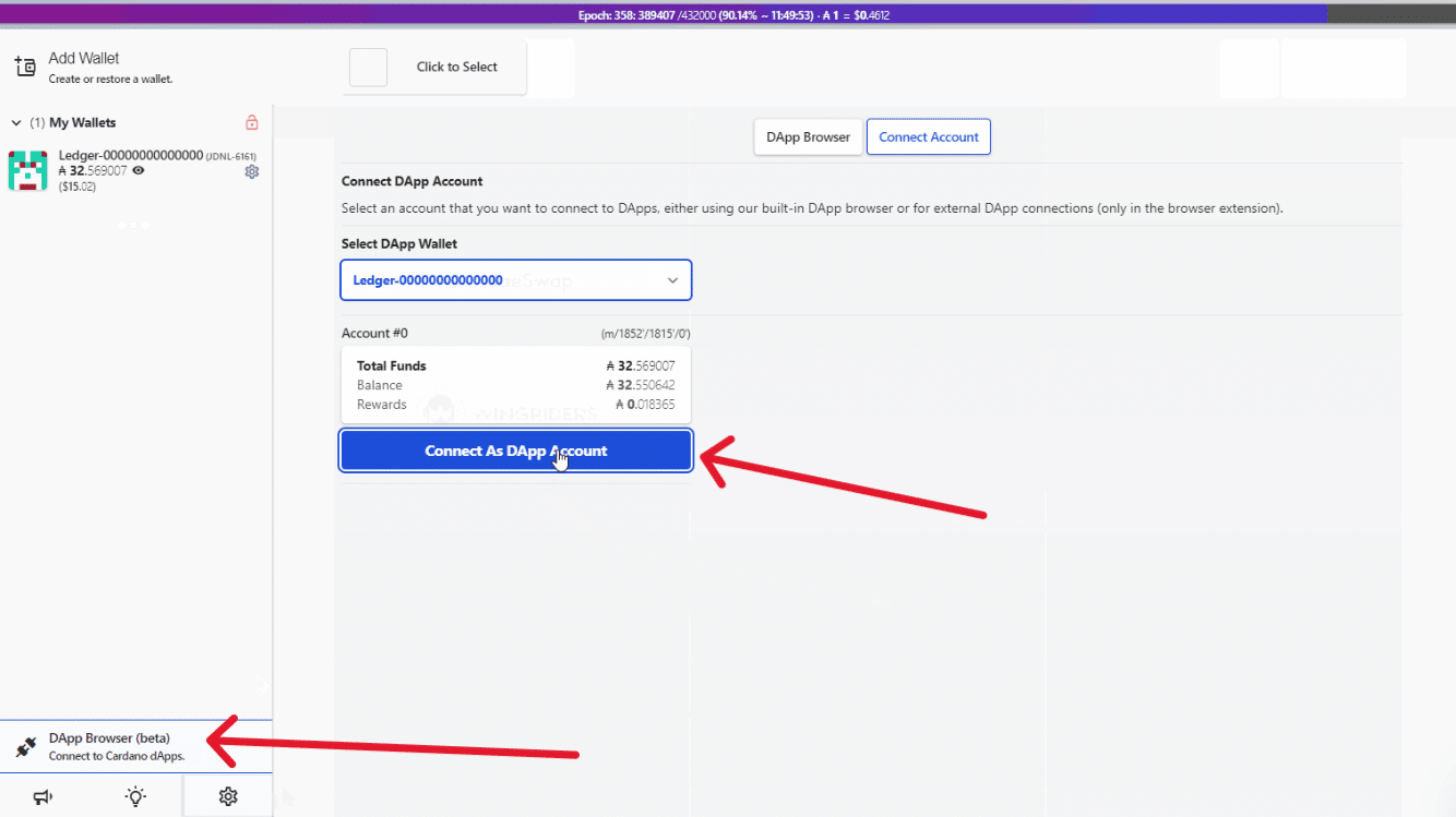 Eternl拡張機能を開き、Dapp Browserをクリックします。jpg.store を選択し、Connect As DApp Account をクリックします。
