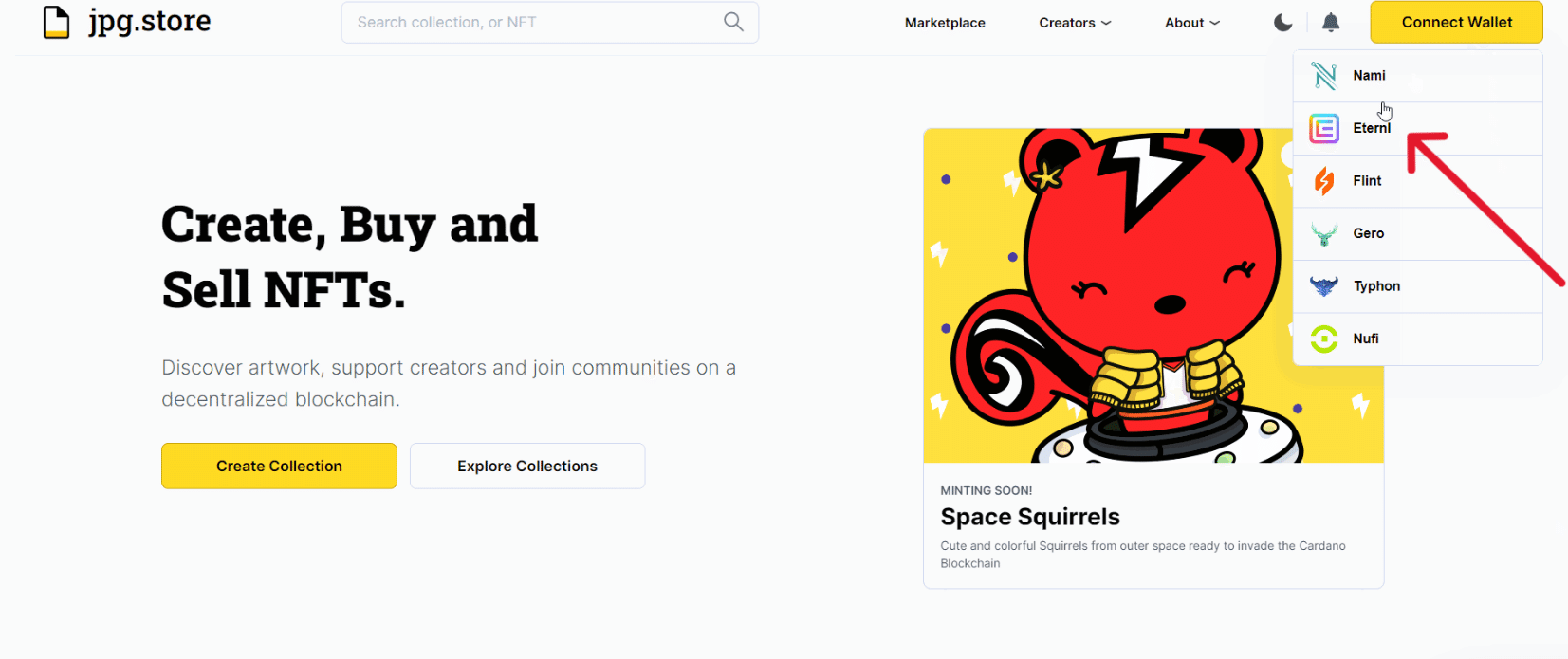 jpg.ストアに行くウェブサイト をクリックし、「Connect Wallet」をクリックします。選択肢の中から「Eternl」を選択します。