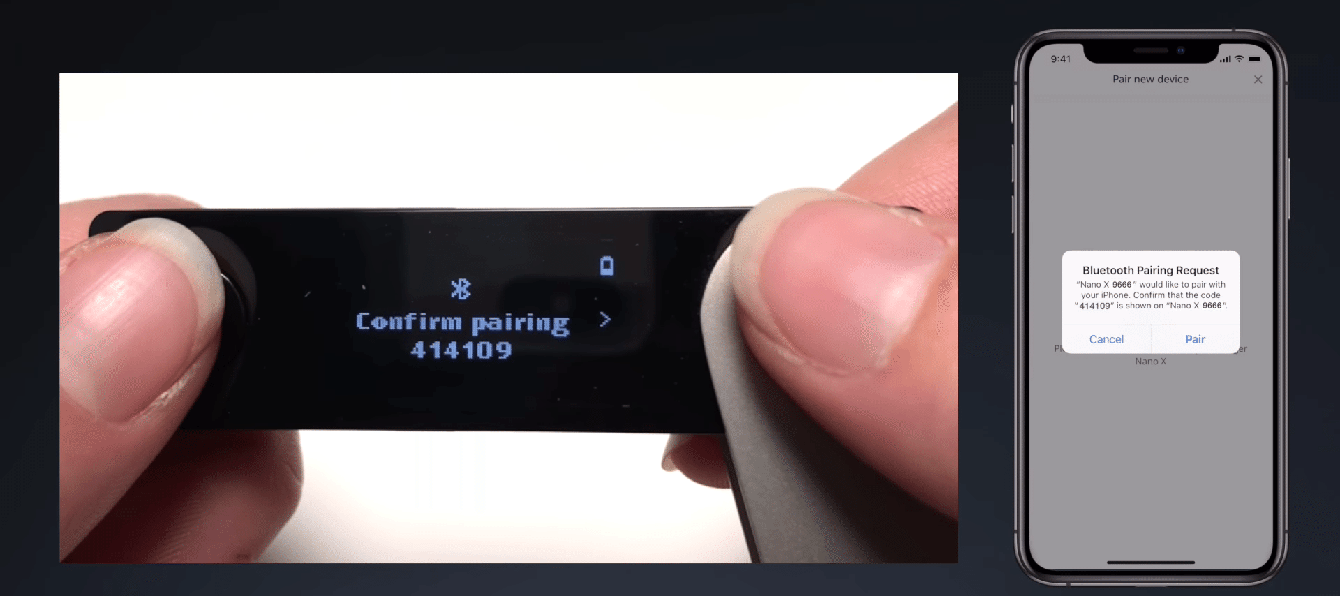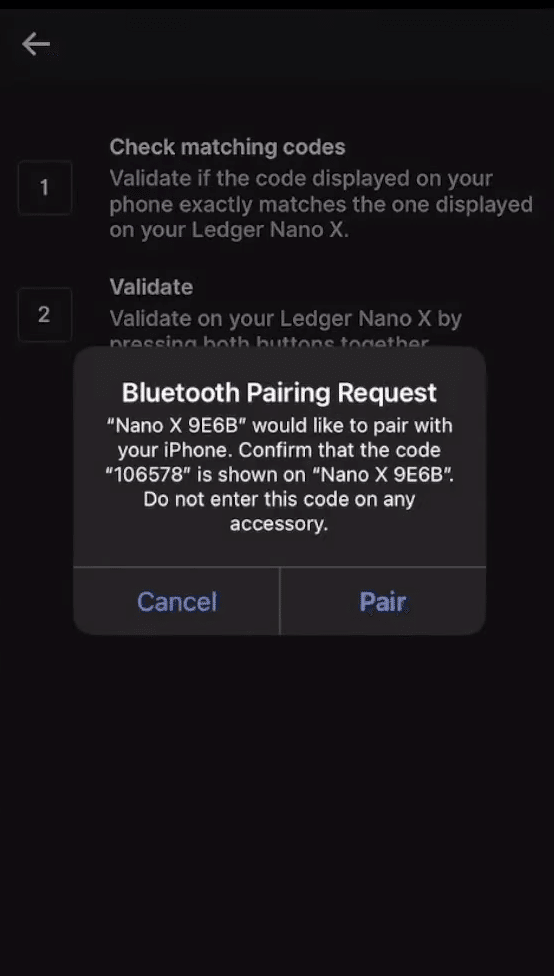 LedgerデバイスとLedger Liveアプリの両方のコードが一致していることを確認し、スマートフォンで「ペアリング」をクリックします。 また、Ledger デバイスの両方のボタンを押して、ペアリングを確認します。