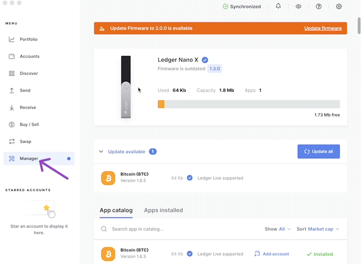 Ledger デバイスが正常に接続されたら、[マネージャー] メニューに移動してクリックします。