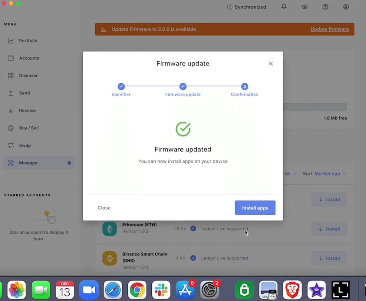 これで、Ledger ファームウェアが正常に更新されました。 元帳デバイスにアプリのインストールを再開できます。 「アプリのインストール」をクリックして次に進みます。