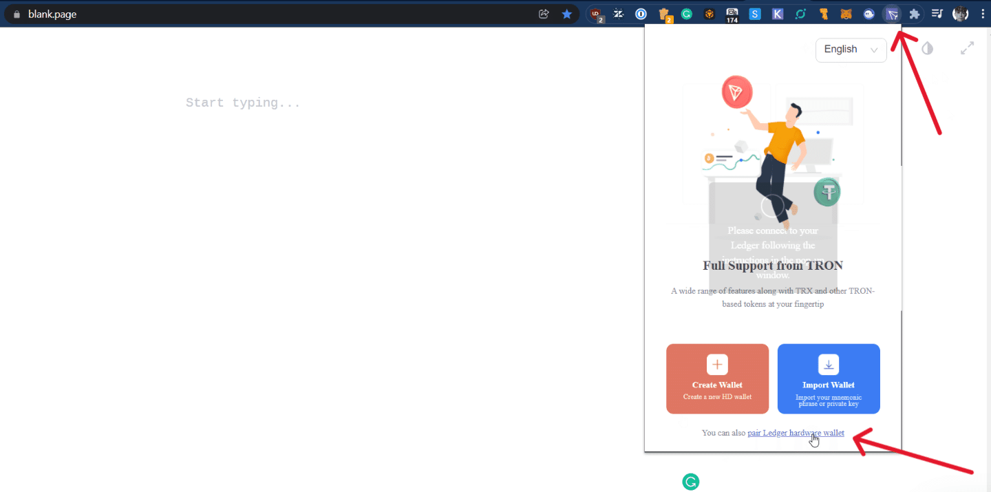 ブラウザを開き、TronLink拡張機能を開き、Pair Hardware walletを選択し、Ledgerデバイスを選択してLedger TronアカウントをTronLinkに接続します。
