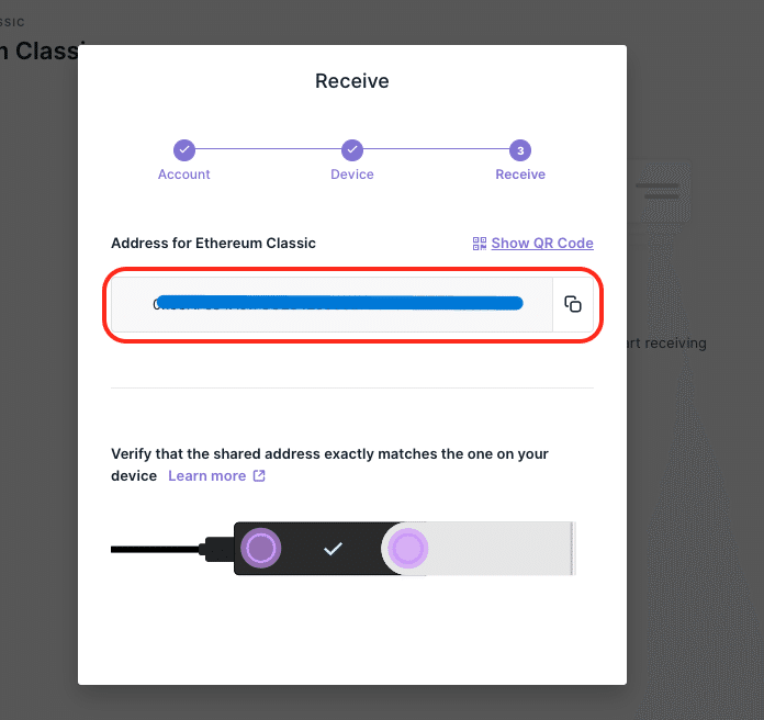 ETCアドレスが生成されるのを待ちます。Ledgerデバイスでアドレスを確認し、すべてが一致したら、Ledger Liveのクリップボードにコピーします。
