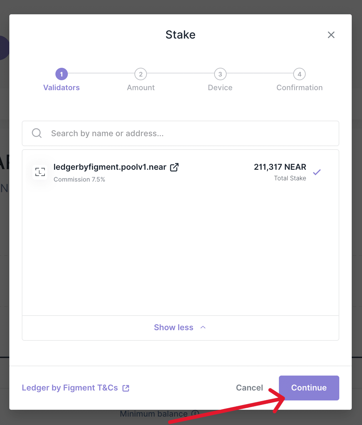 表示されるバリデーションのリストから、Ledger by figmentを選択し、continueをクリックします。