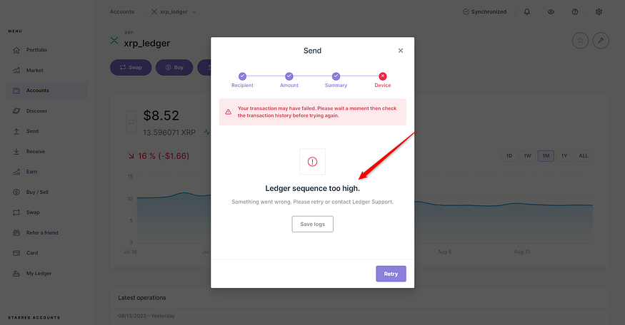 - Ledger Liveで「Ledger sequence too high」というエラーメッセージが表示された場合は、トランザクションを確定するまでに48秒以上が経過したことが原因である可能性があります。