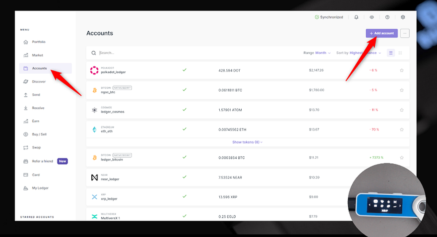 - Ledger Liveを開き、「アカウント」タブに移動し、「+アカウントを追加」を選択する。