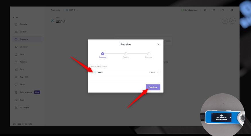 - XRP (XRP)アカウントを選択し、「続行」をクリック。