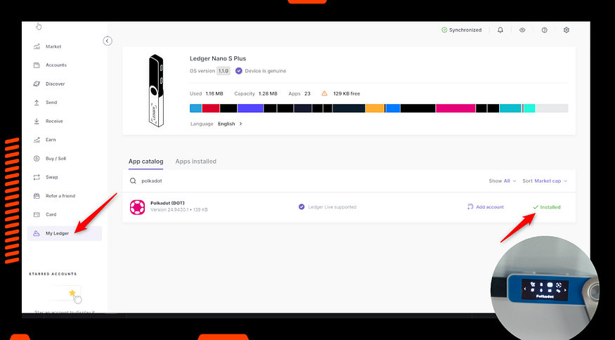Ledgerデバイスに、Polkadot (DOT)アプリをインストールする。