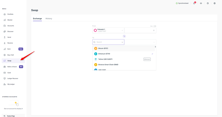 Ledger Liveのスワップ機能を使用すると、Polkadot(DOT)コインを、Bitcoin、Ethereum(ETH)、Solana(SOL)、USDT Tether、XRP、Dogecoin(DOGE)などを含む他の暗号資産と安全にスワップできます。 2023年12月の時点で、Polkadot (DOT) コインとのスワップ取引を開始するには、少なくとも9.66 DOT が必要です。