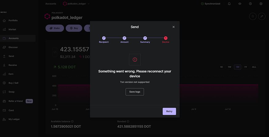 「Something went wrong. Please reconnect your device. Txn version not supported」エラーは、Ledgerデバイス上の Polkadot (DOT) アプリが現在古いバージョンであることを示します。このエラーにより、DOTコインの送付/ステーキング/ノミネーション(指名)/ボンド、または新しいPolkadot (DOT) アカウントの追加ができなくなります。