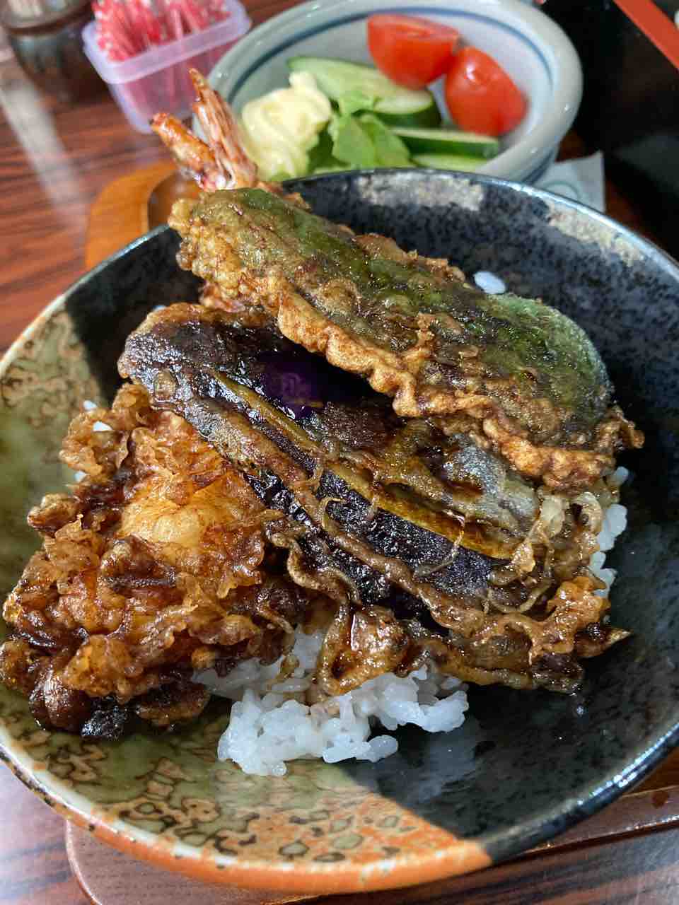 ナスとピーマンとエビがのった天丼。
