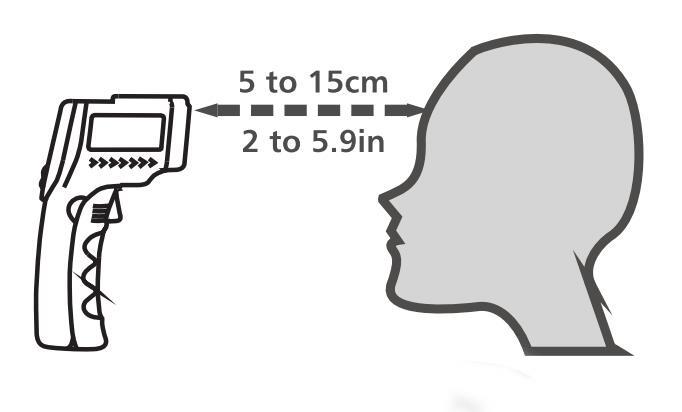 耳たぶの下方、大人は約2.5㎝、乳幼児は1㎝の位置の皮膚に照準ライトを当て、5㎝の幅で水平方向に動かしてボタンから指を離して下さい。測定された体温が、皮膚表面と液晶画面上に表示されます。