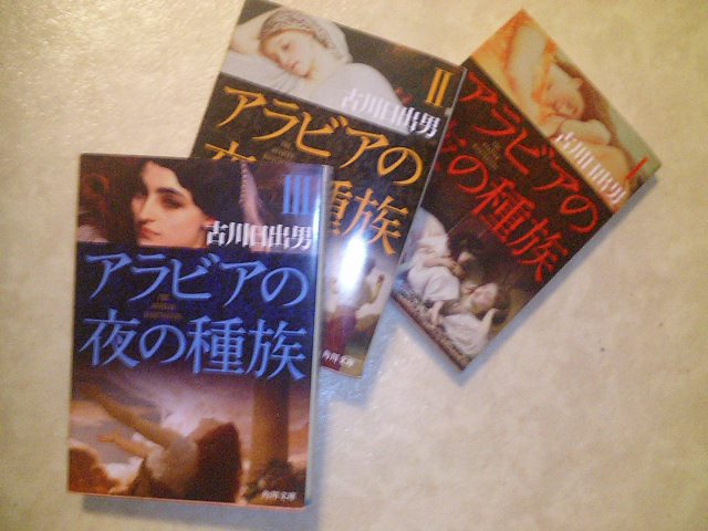 「アラビアの夜の種族」 古川日出男長かった。通勤の間に読めなくなった所為もあるが、文庫が出てすぐ買って今までかかってやっと読了。とある書評番組でカナリ話題になってたから文庫になるのを楽しみにしていた本。「災厄の書」引き込まれてしまう。まぁ構成からいって仕方がないんだろうが、読みにくい事は確かだ。しかし中身の面白さはそれを補って余りある。終わり方が今ひとつか?Ⅰ、Ⅱ巻のスピード感と較べるとチョットね。こういう物語もアリ。読んで損はない