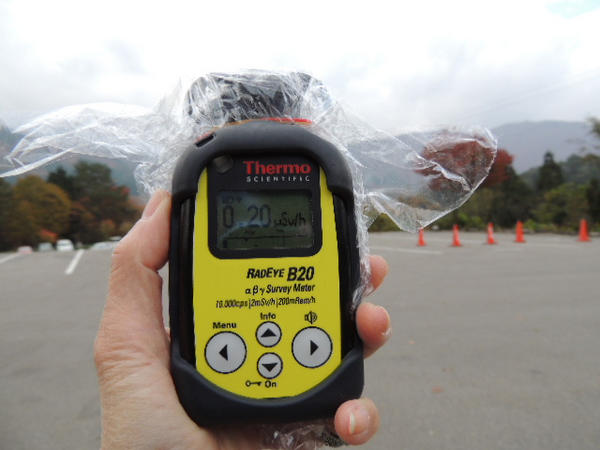 白川郷の展望台。空中が~0.20。地面が0.26。Srが0.37、Co60が0.64Bqと出た。その後の国道360はスリリングで面白い道だった。慣れぬオートマにナンカンのタイヤに落ち葉がどっさりで運転は私でないと駄目だったろうが。 pic.twitter.com/lc7wMgrx