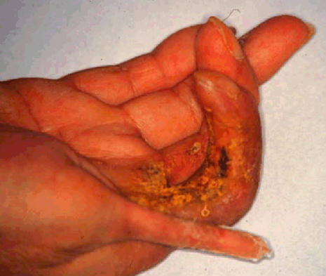 1971年 造船所の構内で、作業員がイリジウム192を拾って持ち帰った。右手の潰瘍と糜爛を繰り返し、22年後に血管の萎縮による右第1指と第2指の拘縮と骨の萎縮、病原菌による感染と疼痛が生じ、2本の指を切断。 pic.twitter.com/0uarIUEX