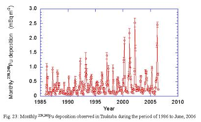 つくばにおける月間239,240Pu降下量は毎年類似の季節変化を示す(Fig. 23)。特に、年間降下量が大きな年は明瞭な春期の降下量極大がみられる。春期の極大の出現時期は、日本における大陸からの風送塵(黄砂)の飛来の時期と一致している。 pic.twitter.com/pFUc2S23