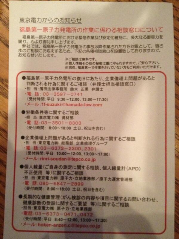 東電から原発作業員に発送されたハガキを入手。『企業倫理上問題があると判断される行為に関するご相談』の窓口が、東電すなわち「倫理上の問題を起こす可能性のある企業」によって暗黙の内に「指定」されてしまっている。これ自体が「倫理上問題」だ。 pic.twitter.com/tgraoMhOhA