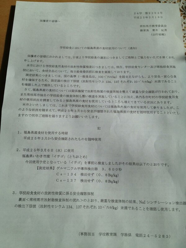 狂ってますね@choi7777: 南相馬市から小学校給食に福島県食材を使う旨の通知がきた。断固反対の電話いれたがダメでした。大人の責任なのだから大人が食せばいい、どうか責任を子供達に押し付けないで欲しい。お願いだ。#genpatsu pic.twitter.com/GmcgXzgKIm"