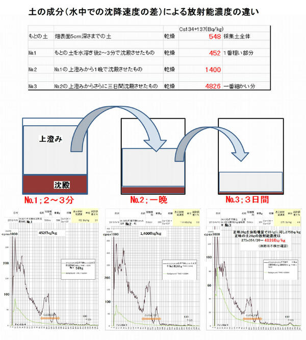 セシウムは比重が軽いのか @hanaharuok もとの土が548に対してもっとも軽いと思われる成分は4800にもなりました。土質による差もあるかと思います。いずれにしても土の平均的放射能濃度より高いものが舞っていることはわかります。 pic.twitter.com/rQabd7Z2sO