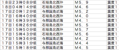 石垣、与那国 地震まとめ(画像) 確認してください。体感は震度1です。でも、マグニチュードが大きい。この影響がどこに出るのか、気がかりです。尚、三宅島近海は昨日より40回以上揺れが継続中。石垣から北の太平洋側、特に警戒してください。 pic.twitter.com/RIuRGmrWR4