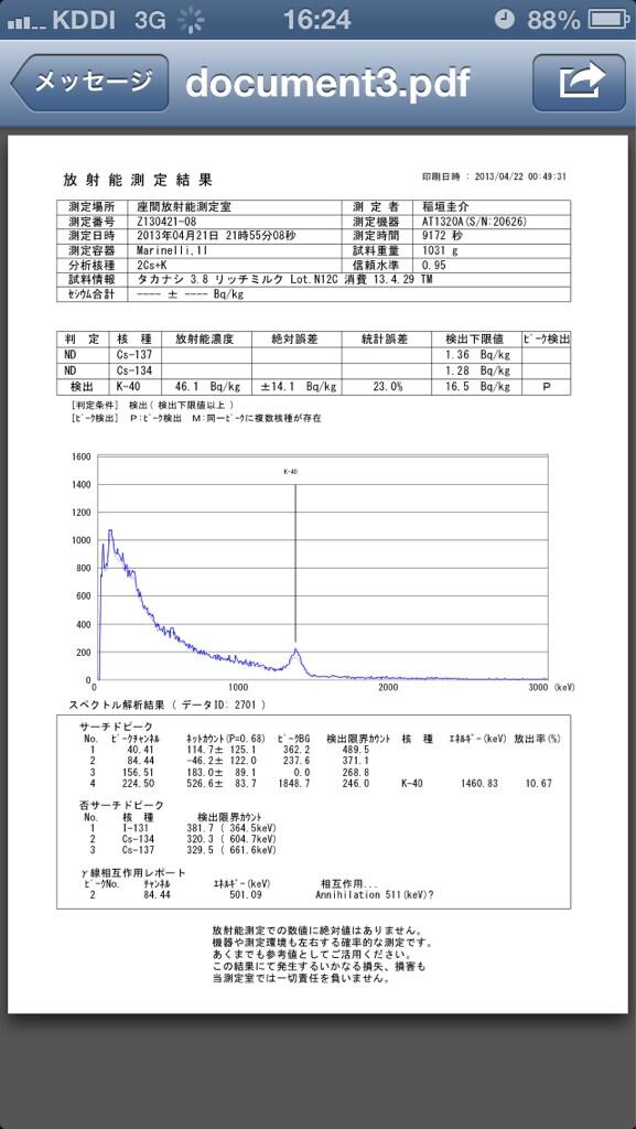 神楽坂ラレッテラにてお使いのタカナシ乳業リッチミルクの測定結果です。座間放射能測定室@zamasokutei にて不検出となりました。 pic.twitter.com/jKghKgDChn