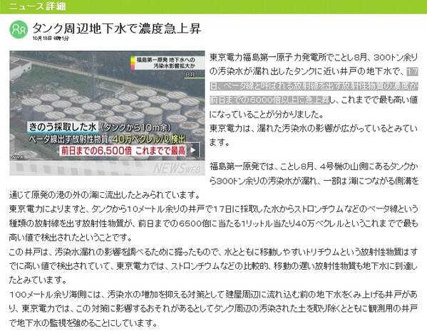 タンク周囲の地下水の濃度急上昇が、とてつもない。 6000倍!