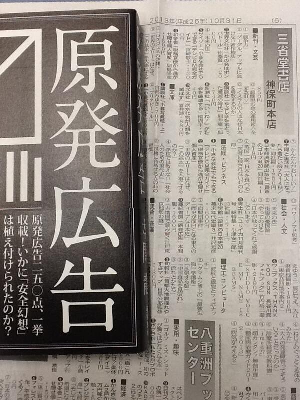 マスコミは311まで東電ベッタリだった事実を隠しておきたいのです。本書では250以上の事例でその事実を明らかにしました。RT @akishobo: 本間龍さんの新刊『原発広告』ですが、三省堂書店神保町本店の社会・人文書の9位に初登場ですpic.twitter.com/ErNUWznWQQ