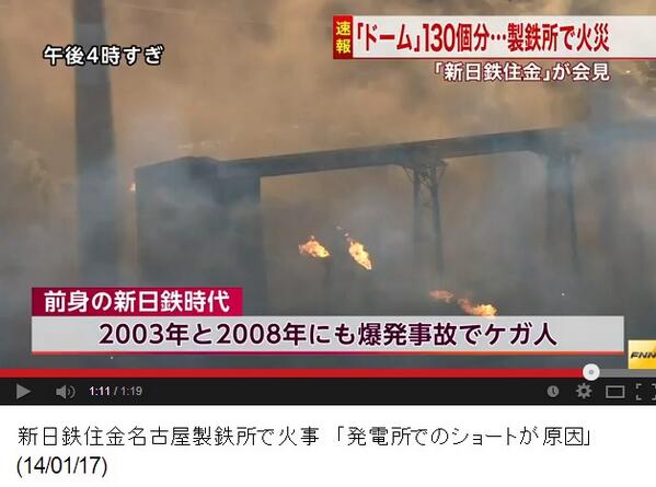 新日鉄住金名古屋製鉄所で火事 「発電所でのショートが原因」(14/01/17)