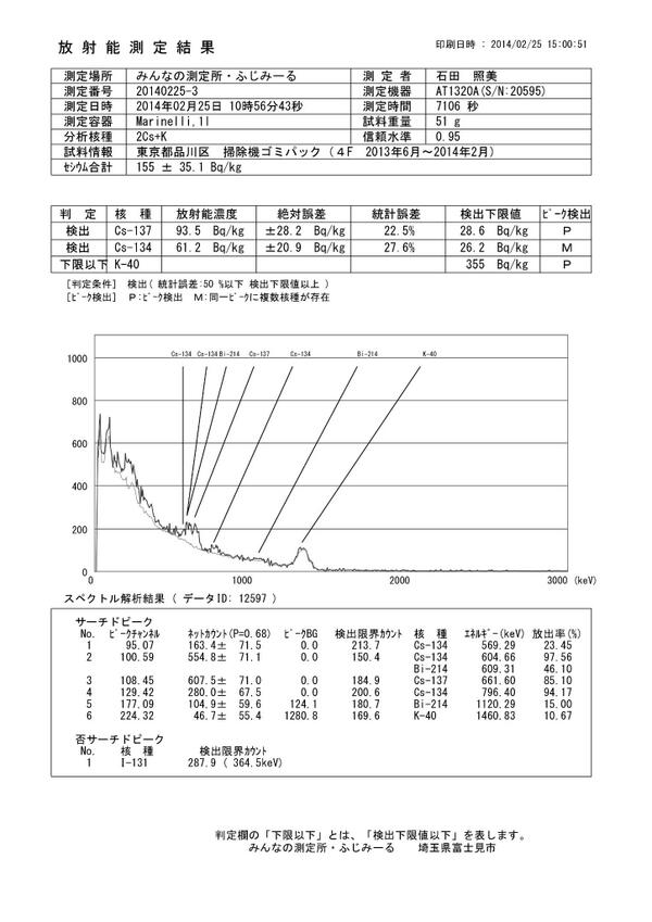 「東京都品川区 掃除機ゴミパック(4F 2013年6月~2014年2月)」7106秒測定。検体重量、51g。セシウム合計、155±35.1Bq/Kg検出。検出下限値、Cs134、26.2Bq/Kg。Cs137、28.6Bq/Kg。 pic.twitter.com/32nP9p4UfU
