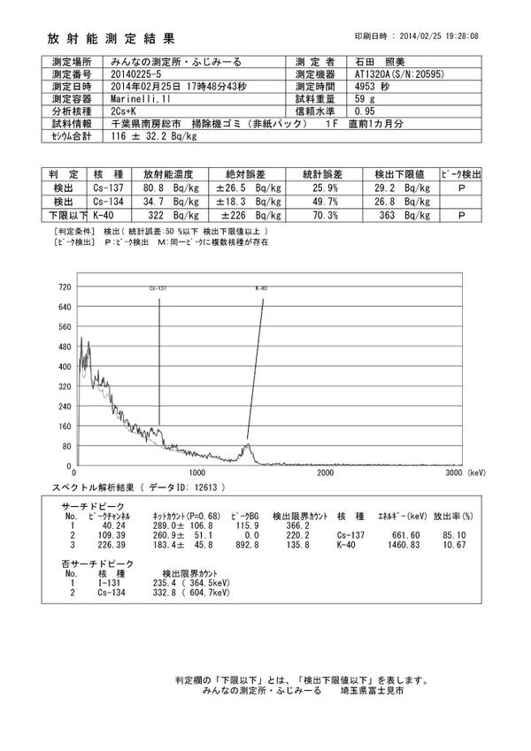 「千葉県南房総市 掃除機ゴミ(非紙パック) 1F 直前1カ月分」4953秒測定。検体重量、59g。セシウム合計、116±32.2Bq/Kg検出。検出下限値、Cs134、26.8Bq/Kg。Cs137、29.2Bq/Kg。 pic.twitter.com/lJUSK1fBO7