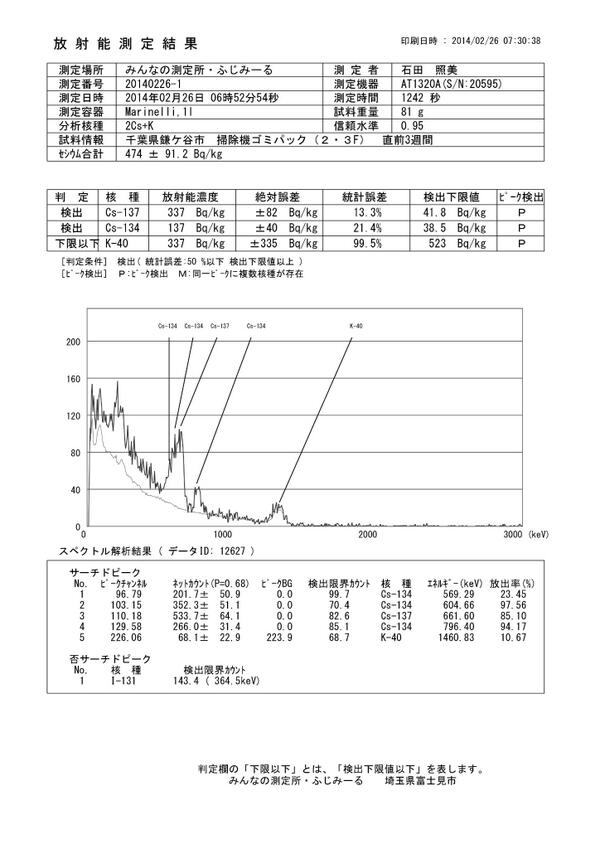 「千葉県鎌ケ谷市 掃除機ゴミパック(2・3F) 直前3週間」1242秒測定。検体重量、81g。セシウム合計、474±91.2Bq/Kg検出。検出下限値、Cs134、38.5Bq/Kg。Cs137、41.8Bq/Kg。 pic.twitter.com/TQO63pPeWp