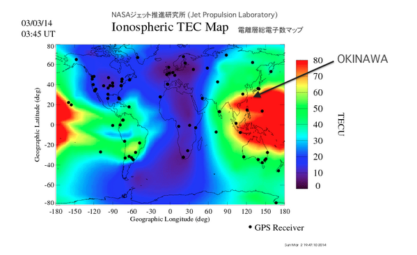 数日前の太陽フレア(twitter.com/TOHRU_HIRANO/s…)の影響もあるのだろうけど、電子数が高い。今朝、沖縄でマグニチュード6.6とM5の大きな地震が2回(画像:NASA・電離層電子数) pic.twitter.com/U102z7KU1F