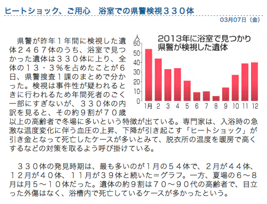 「長野県:昨年、検視した遺体2467体のうち、浴室で見つかった遺体は330体で、全体の13.3%と、6日の県警のまとめで判明。約9割が70歳以上の高齢者:shinmai.co.jp/news/20140307/… pic.twitter.com/zWgf6ZYIzv