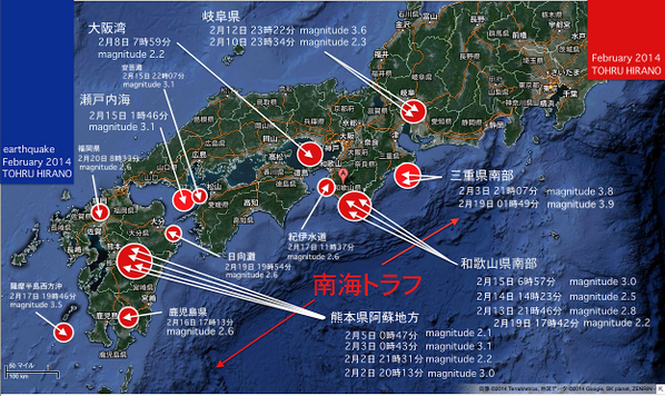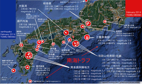 2月になり南海トラフ震源域の内陸部で、気象庁が公表してるだけで19回の地震が発生してます。この頻度の西日本の地震回数は稀です。放射能、大雪など大変な事が多々あるけど「地震への備え」は、していた方が良いです pic.twitter.com/kX58jtq37N