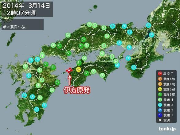 2014年3月14日 2時06分: 震源地:伊予灘・最大震度5(北緯33.7度、東経131.9度、深さ80km:typhoon.yahoo.co.jp/weather/jp/ear…) 13日に九州の原発の再稼働審査をすると決まった矢先の地震。神はいるよね。 pic.twitter.com/Os9Kr6kCgJ