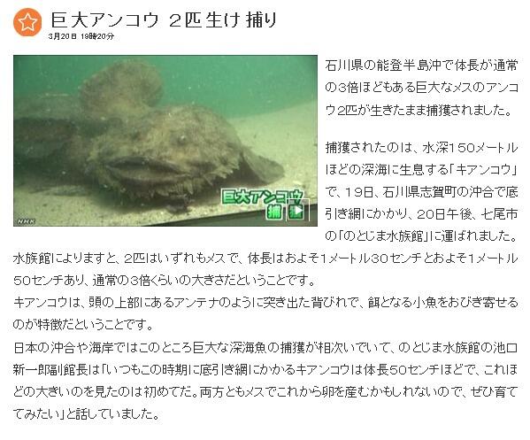 ・能登半島沖、体長130cmと150cmのメスのアンコウ2匹生きたまま捕獲
